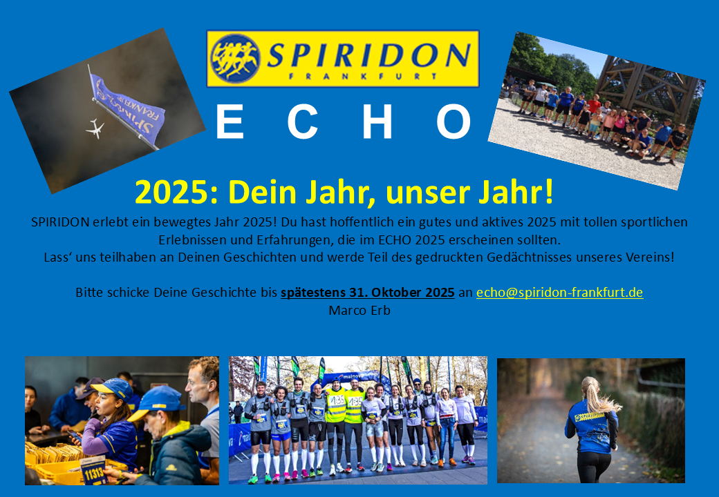 SPIRIDON erlebt ein bewegtes Jahr 2025! Du hast hoffentlich ein gutes und aktives 2025 mit tollen sportlichen Erlebnissen und Erfahrungen, die im ECHO 2025 erscheinen sollten.
